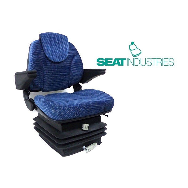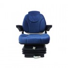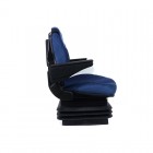 Sedile Activo in velluto blu con molleggio meccanico. Completo di braccioli e poggiatesta. Telaio portante in lamiera e cuscini ergonomici avvolgenti.